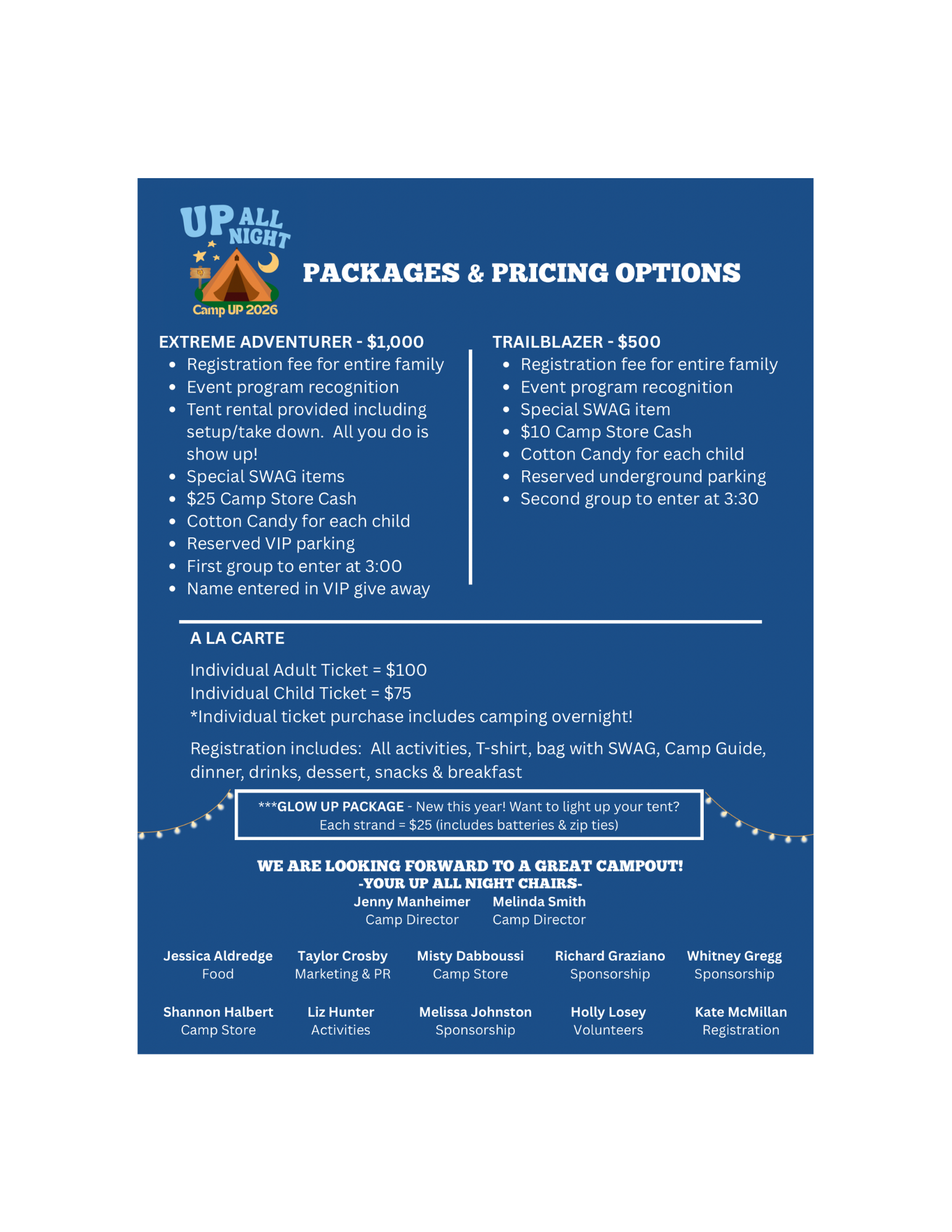 Our Services UP All Night Extreme Adventurer $1,000.00 Trailblazer $500.00 Adult $100.00 Child $75.00 Glow-Up! $25.00 Sponsorships from $500.00 4th Grade Ads from $250.00